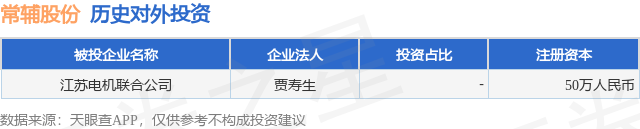 本站消息浩广配资,根据天眼查APP显示,常辅股份(920396.BJ)新增一起对外投资事件,被投资公司为江苏电机联合公司浩广配资,法定代表人贾寿生,投资占比为-。该公司从事电气机械和器材制造业,注册资本为50万人民币。目前,常辅股份共存在对外投资1项,详见下表: