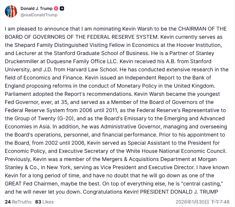 格隆汇1月30日|特朗普发文称,我很荣幸地宣布,提名凯文·沃什出任美联储主席。凯文现任胡佛研究所谢泼德家族杰出客座经济学研究员及斯坦福大学商学院讲师,同时也是杜肯家族办公室与斯坦利·德鲁肯米勒的合伙人。他持有斯坦福大学文学学士学位及哈佛法学院法学博士学位,在经济学与金融领域开展了广泛研究。在加入美联储理事会前,他于2002年至2006年担任总统经济政策特别助理兼白宫国家经济委员会执行秘书。此前,他在纽约摩根士丹利并购部门担任副总裁兼执行董事。我与凯文相识很长时间,坚信他将成为史上最杰出的美联储主席之一,或许是最出色的一位。他不仅具备一切所需资质,更拥有领袖气质,绝不会令大家失望。祝贺凯文!